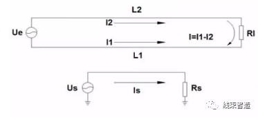 Us为干扰信号源,干扰电路Is在双线的两条导线L1、L2上产生的干扰电流分别是I1和I2。