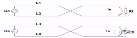 导线L1上的电流I1在被串回路L3和L4中产生感应电流I31和I41,I41>I31,在被串回路中形成串扰电流I11=I41-I31,同样,导线L2上的电流I2在被串回路L3和L4中产生感应电流I32和I42,I42>I32,在被串回路中形成串扰电流I12=I32-I42,总干扰电流I=I11+I12,由于L1与L3、L4的距离比L2较近,I=I11+I12>0,在回路Us中形成干扰。