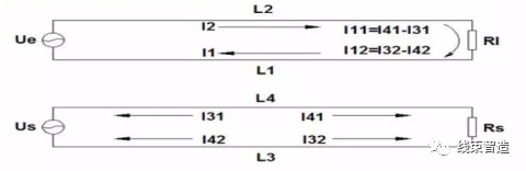 在L1上存在干扰电流I11和I12,在L2上存在干扰电流I21和I22,干扰电流I=I21+I22-I11-I12,由于两端线路的条件相同,所以,总干扰电流I=0。